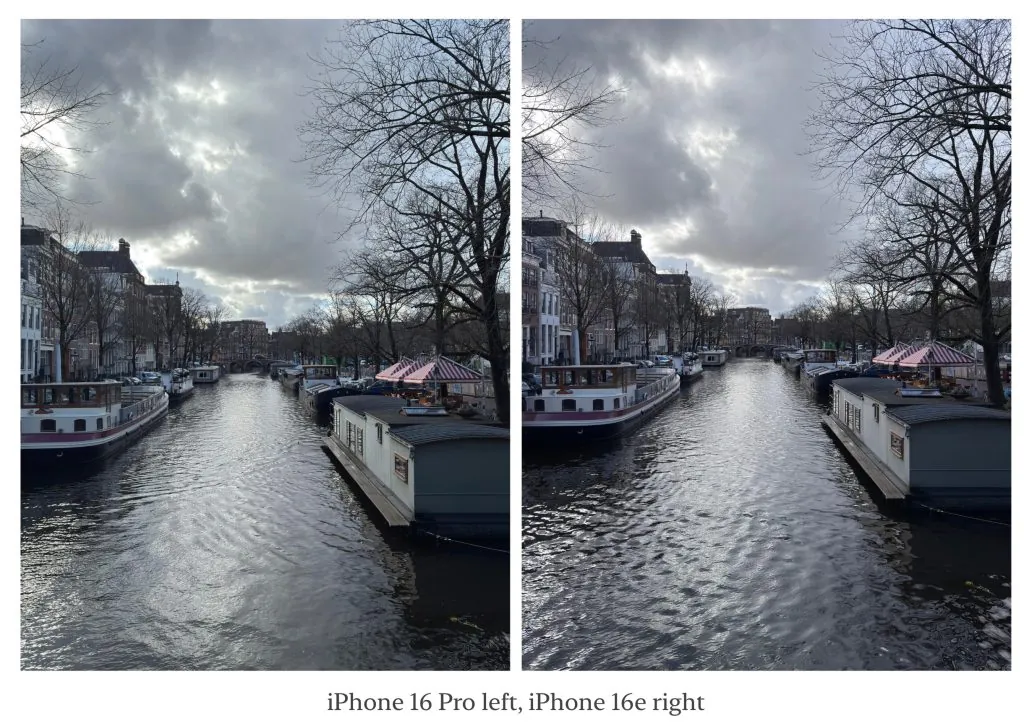 何か少し変わった点に気づきましたか?色(iPhone 16eの方が一貫してピンク色で暖色系の写真を撮っていました)は別として、iPhone 16eの画角はわずかに狭くなっています。カメラの焦点距離はiPhone 16 Proほど広角ではなく、約2mm(26mm対24mm換算)です。実際に使ってみると、これは私にとっては良い感じでした。独立したズームレンズがないので、少しズームが寄れるのは良いトレードオフです。