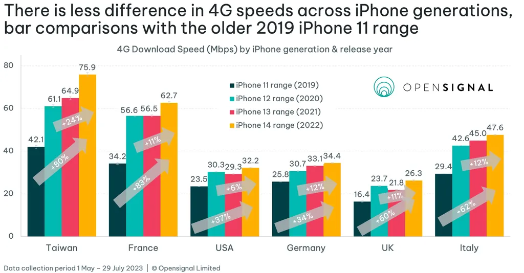 2022年秋にiPhone 14シリーズが発売されると、特にiPhone 14 ProとPro Maxで5Gパフォーマンスの大幅な向上が見られました。