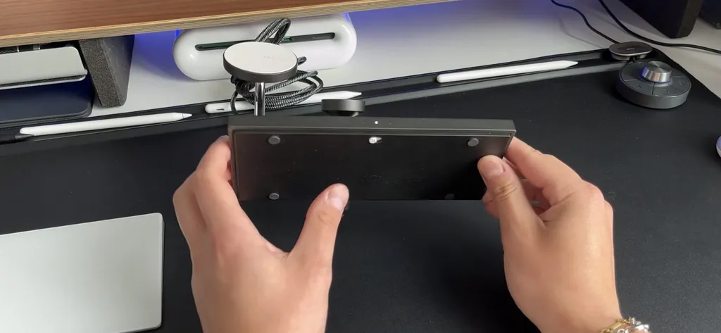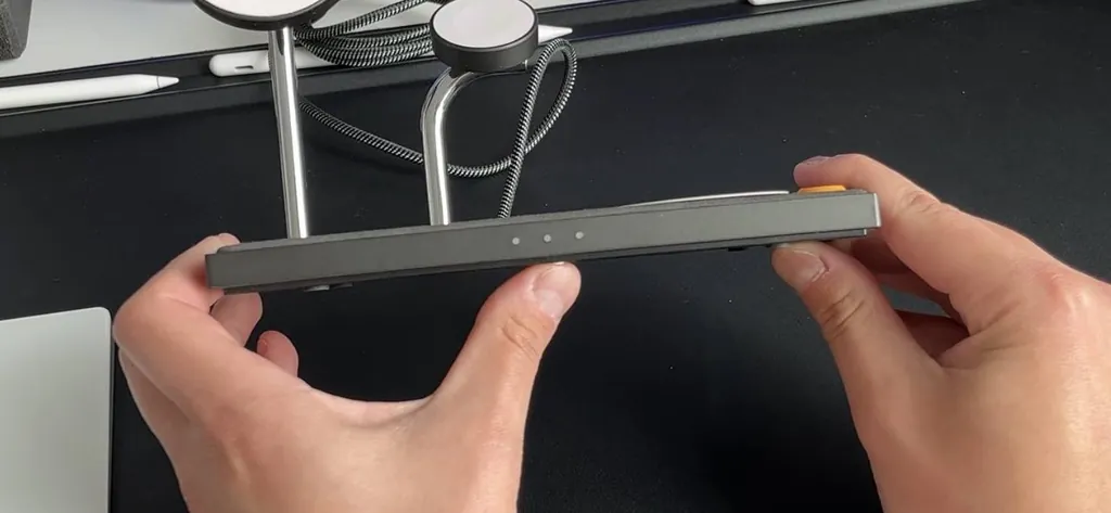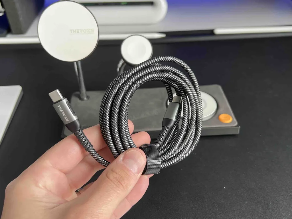 ベースはしっかりとした作りで、iPhoneをスタンドから外す際に充電ステーションを持ち運ぶ心配もありません。プラスチック製ですが、金属のような質感のブラシ仕上げが施され、ベースには柔らかな手触りのアルカンターラ仕上げが施されています。箱には、非常に高級感のある2mのUSB-C-USB-Cケーブルが付属しており、オプションで65W GaN充電器を25ドルで追加することもできます。